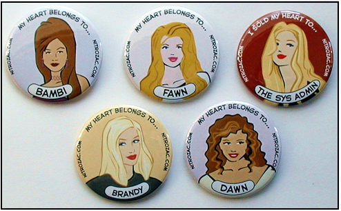 Wear your favorite Techno-Talking Babe on your sleeve, chest, knapsack, laptop bag, or anywhere else you can stick it! And what's this? A bonus villainous babe! Yes, it's the dastardly, devious, and devilishly sexy Sys Admin! Four TTB buttons and the Sys Admin... for only $8.25! The same as magnets only $9.95. ![]()