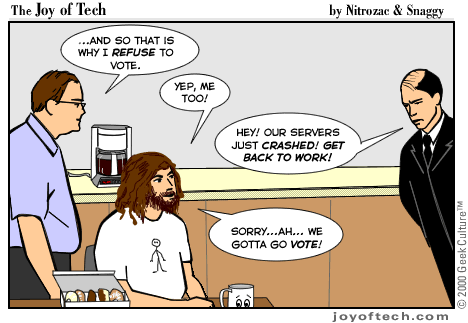 Welcome to the Joy of Tech... illustrated by Nitrozac and written by Nitrozac and Snaggy. It's a little bit simpler in style than our other comic After Y2K, and a little more topical. We hope you enJoy!